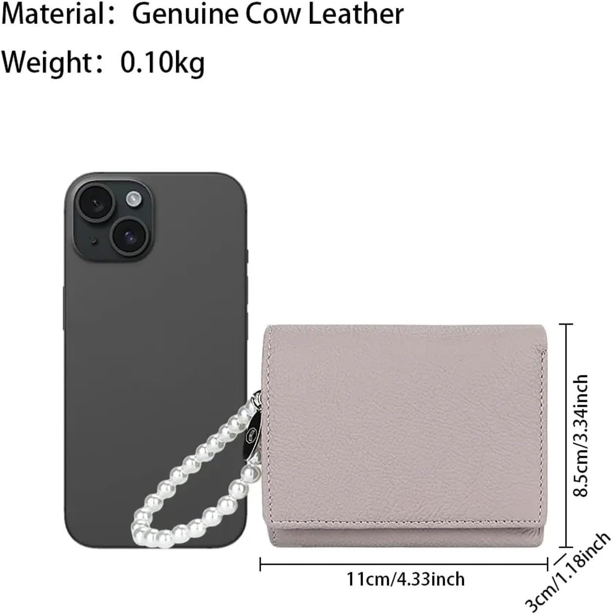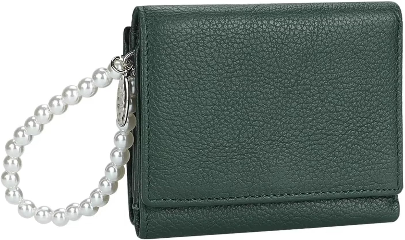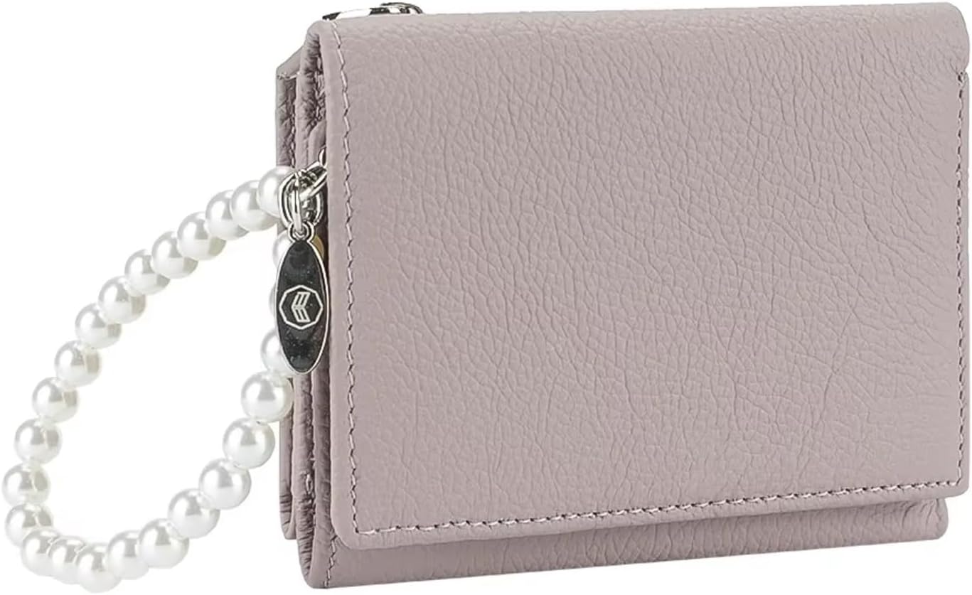 A tri-fold short wallet with zipped coin purse for women. It is made of soft genuine real leather, stylish and practical. Large compacity can hold credit cards, cash, coins and all valuable essentials. A detachable beautiful pearl hand strap makes it easy to carry.