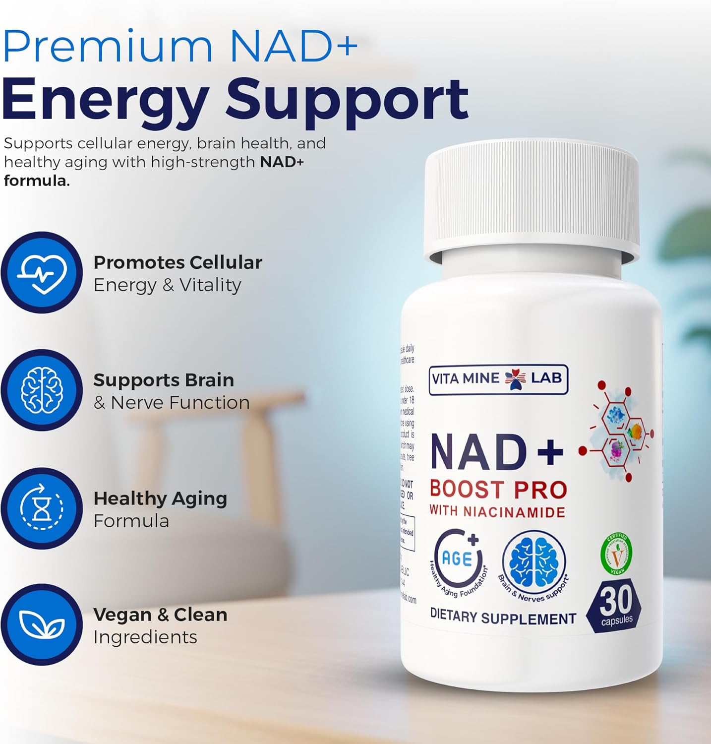 VITA MINE LAB NAD+ Boost Pro is a premium dietary supplement designed to support your body’s natural energy production, brain function, and muscle health. Each capsule contains 300 mg of Nicotinamide Riboside (NR) and Niacinamide (Vitamin B3), both scientifically recognized precursors to NAD+, a vital coenzyme that plays a key role in cellular metabolism and energy production. This supplement is Halal, Vegan, and Gluten-Free, making it suitable for a wide range of dietary preferences. Manufactured in a GMP-certified facility in the USA, each capsule ensures purity, potency, and safety. These statements have not been evaluated by the Food and Drug Administration. This product is not intended to diagnose, treat, cure, or prevent any disease.